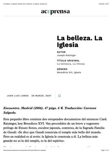 Joseph RATZINGER, La belleza. La Iglesia, trad. de Carmen Salgado, Encuentro, Madrid 2006, 42 pp.